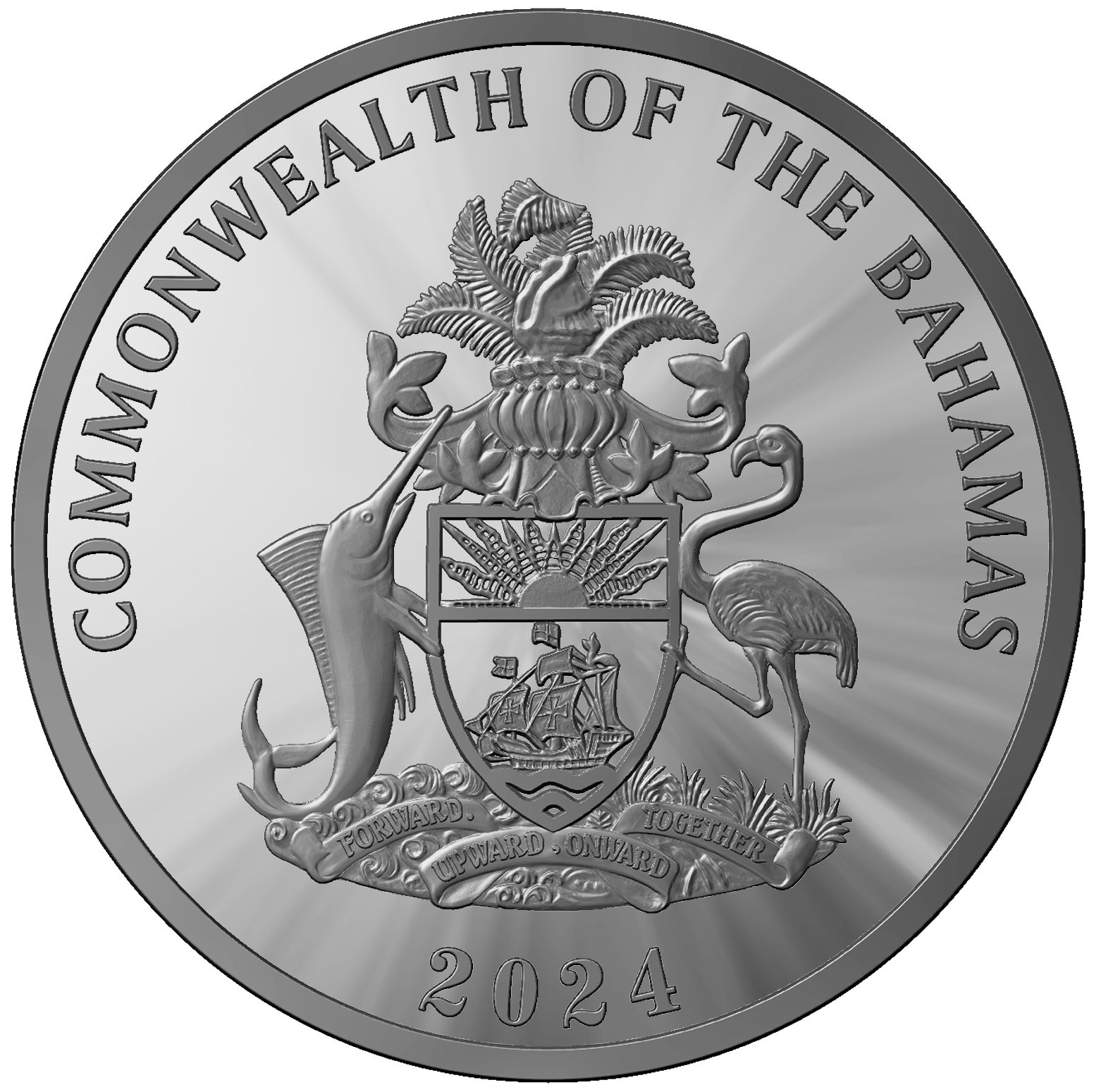 Awers: Wzdłuż górnej krawędzi nazwa państwa: COMMONWEALTH OF THE BAHAMAS. Na dole rok emisji: 2024: W centrum herb Wspólnoty Bahamów
