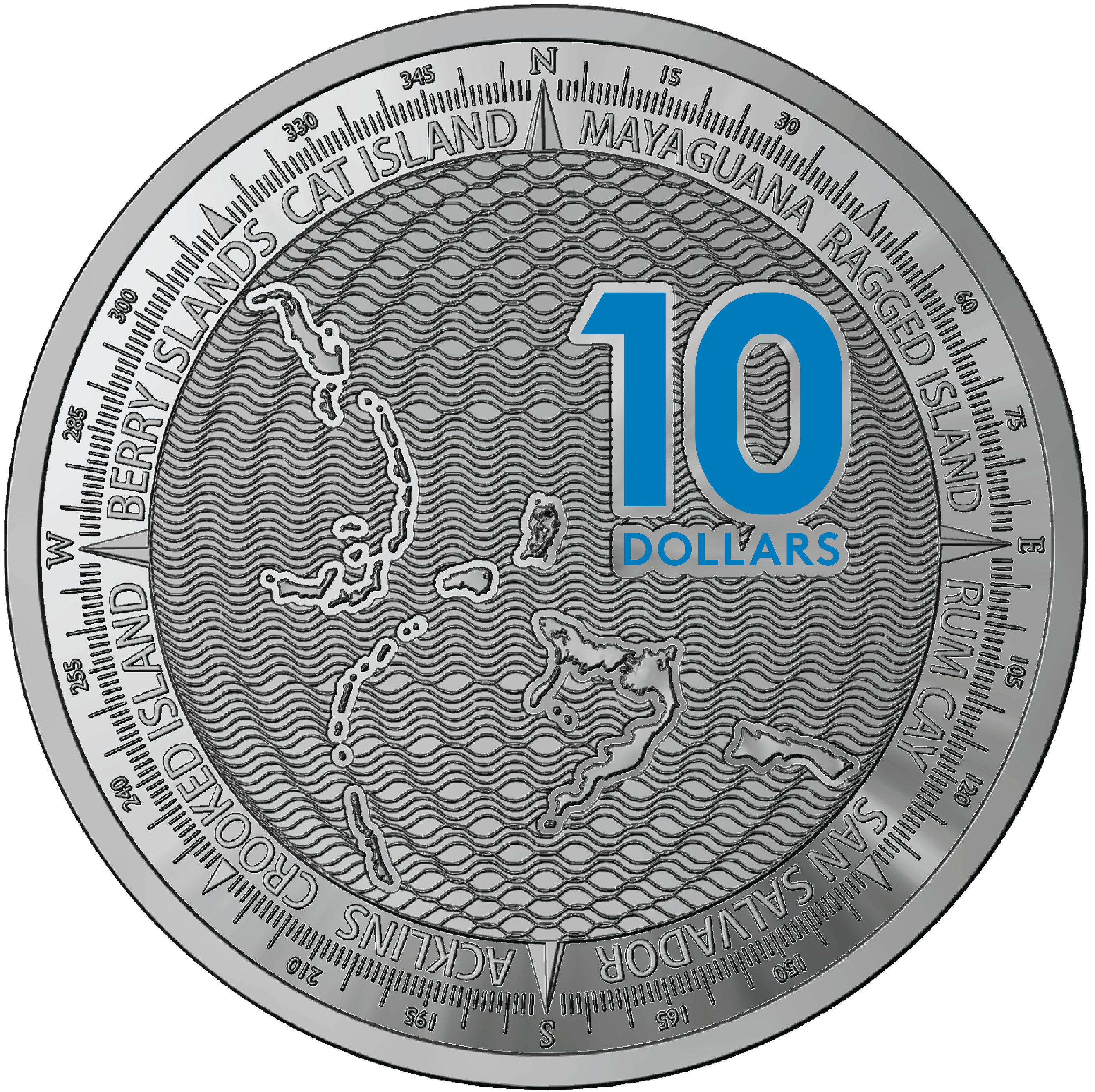 Rewers: Kompozycja przedstawiająca tarczę kompasu/busoli ze stylizowanym morzem i konturami wysp oraz nazwami: MAYAGUANA, RAGGED ISLAND, RUM CAY, SAN SALVADOR, ACKLINS, CROOKED ISLAND, BERRY ISLAND, CAT ISLAND. Na górze z prawej strony kolorowy nominał i nazwa waluty: 10 / DOLLARS