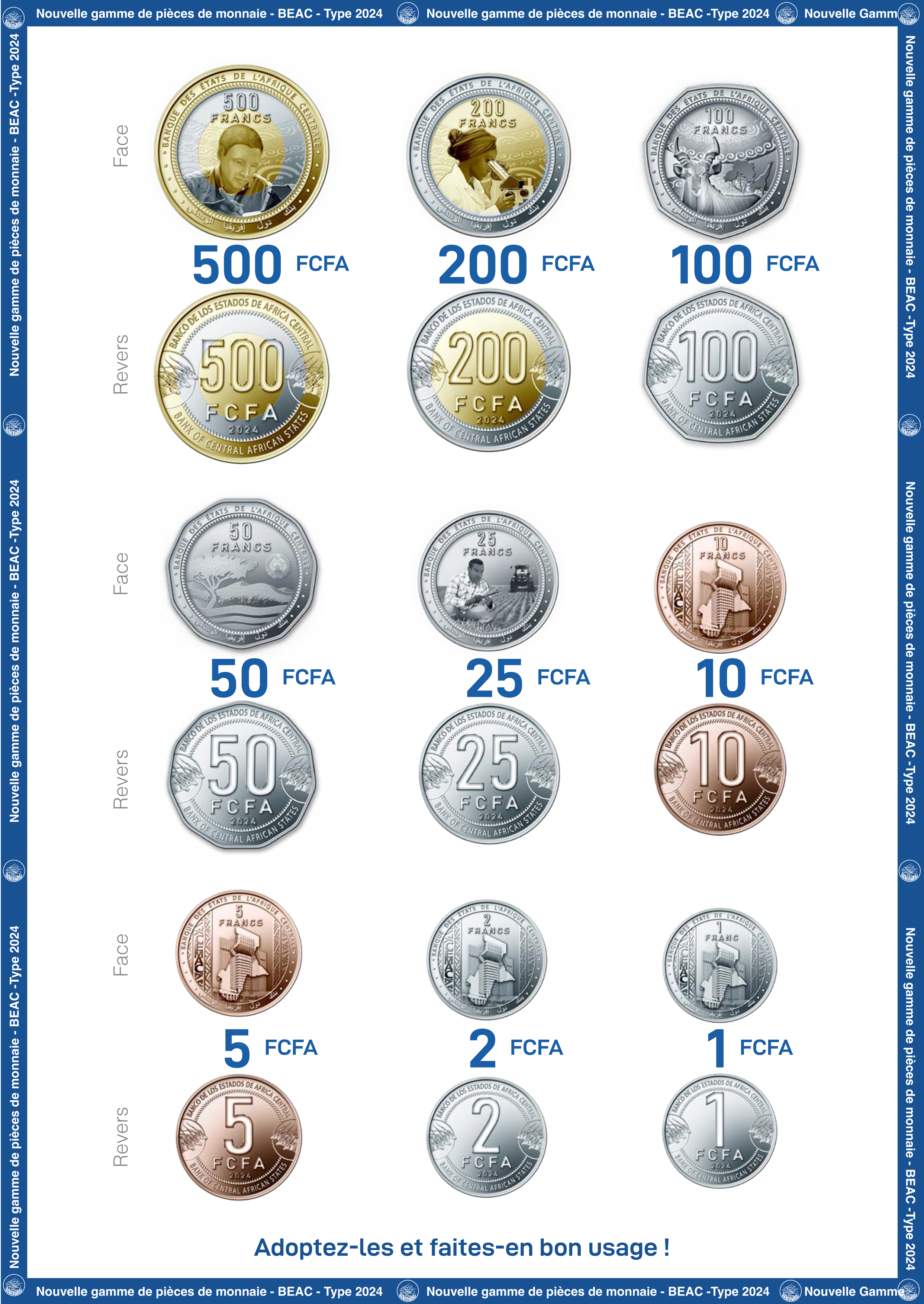 Ostatecznie seria „Typ 2024” obejmuje dziewięć nominałów: 1, 2, 5, 10, 25, 50, 100, 200, 500 franków. Łączy ona w sobie zwiększone bezpieczeństwo i wyjątkowy design. Monety zostały wybite przy użyciu odpornych i przyjaznych dla środowiska metali, ze specjalnymi grawerunkami ilustrującymi integrację subregionalną i historię państw CEMAC. Szczególny nacisk położono na temat edukacji, pozycji kobiet w społeczeństwie, nowoczesnego rolnictwa, a także ochrony roślin i zwierząt.