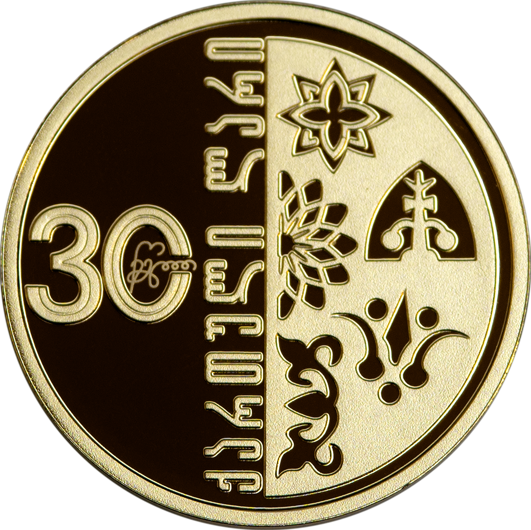 – na lewej połowie stylizowany napis: 30 წელი (30 lat). Na mocie srebrnej w kolorze
