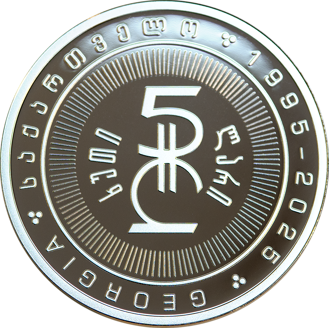 – wzdłuż krawędzi, na wydzielonym otoku, nazwa państwa w języku angielskim i gruzińskim oraz lata rocznicowe, rozdzielone „winogronem”: GEORGIA ꖜ საქართველო ꖜ 1995 – 2025 ꖜ