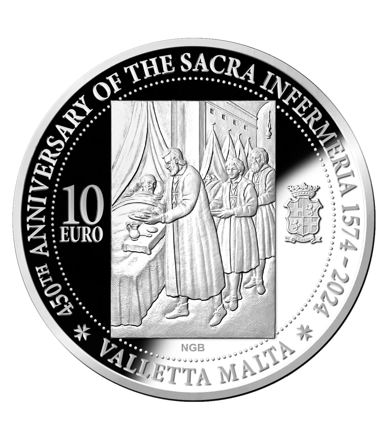 – wzdłuż krawędzi napis rozdzielony krzyżami maltańskimi: 450TH ANNIVERSARY OF THE SACRA INFERMERIA 1574 – 2024 VALLETTA MALTA