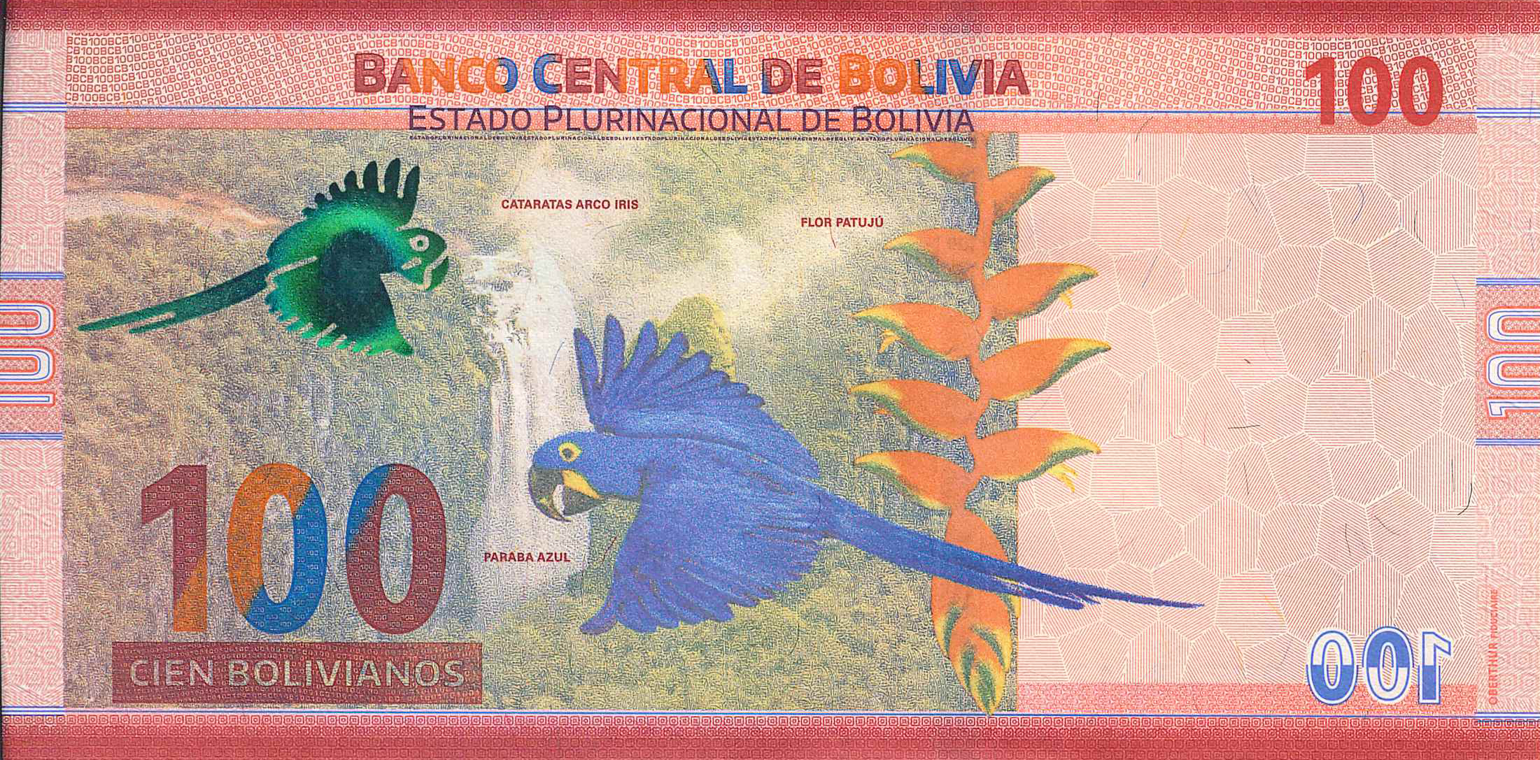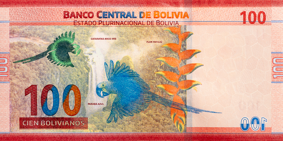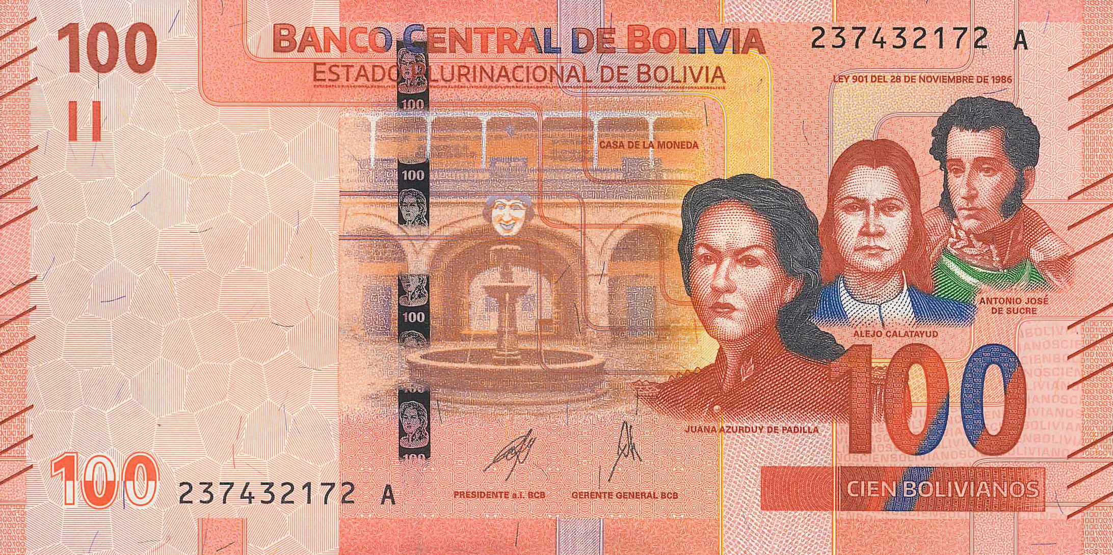 – na dole z lewej strony nominał liczbowy i słowny z nazwą jednostki: 100 / CIEN BOLIVIANOS