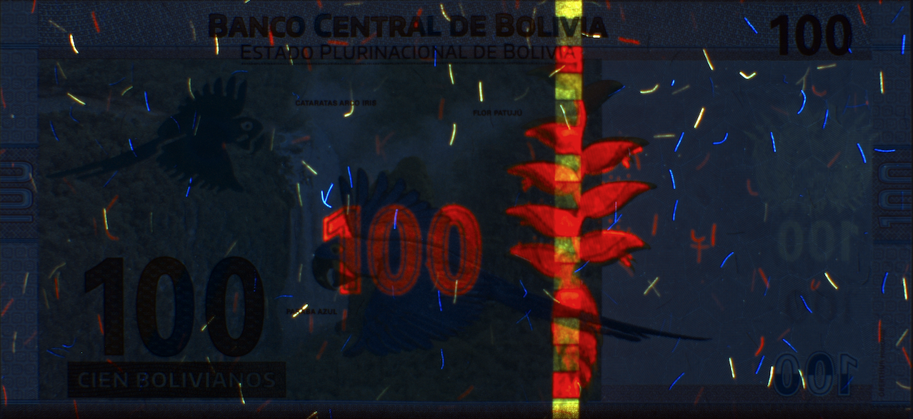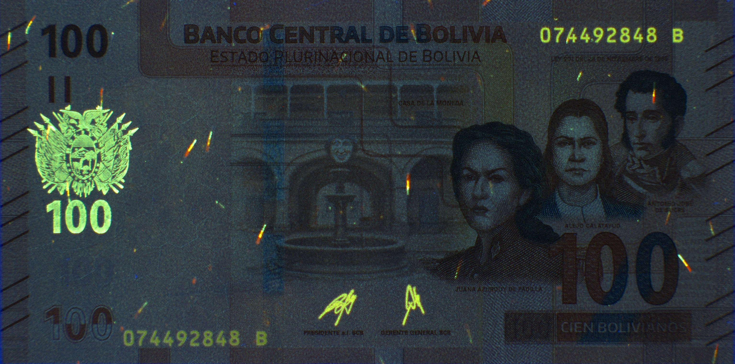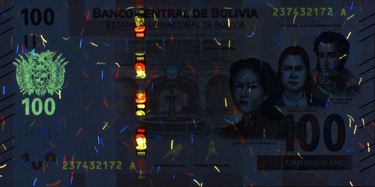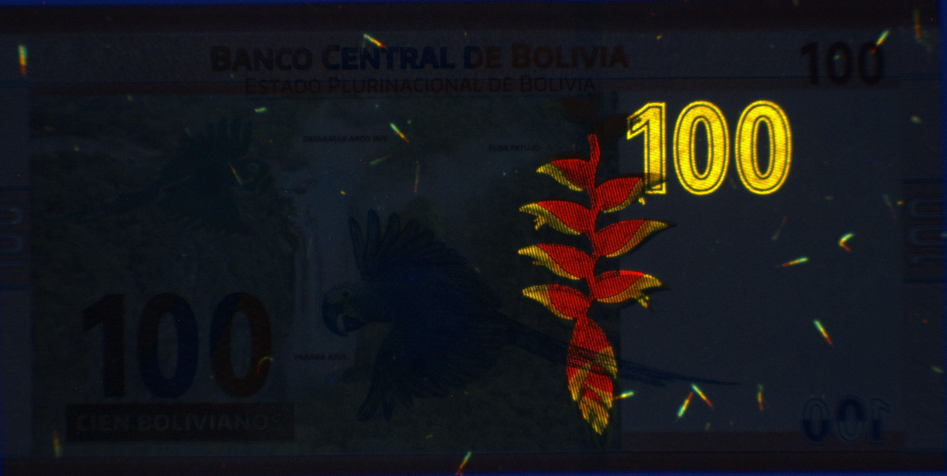 – na prawo od znaku wodnego pasek zabezpieczający z portretem Juany Azurduy de Padilla oraz liczba/nominał „100”. Dynamiczna zmiana koloru i ruchu (podgląd)