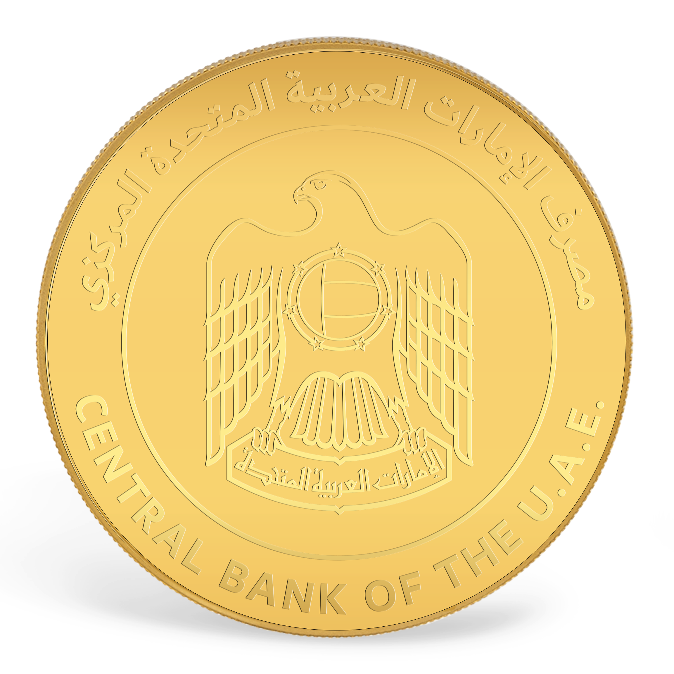 – pod godłem nazwa jednostki w języku arabskim i angielskim oraz nominał: درهم / Dirhams 100 (którego nie ma na wizerunku złotej monety)