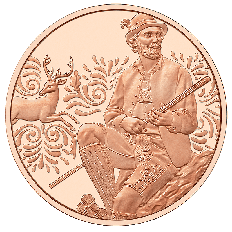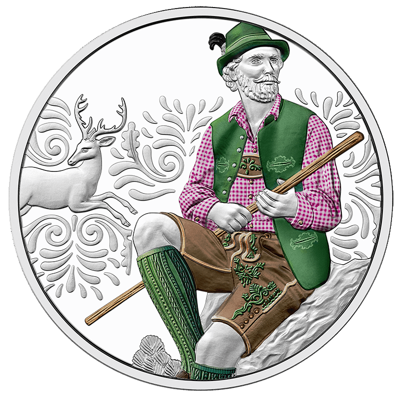 – kompozycja przedstawiająca siedzącego mężczyznę w kapeluszu i skórzanych spodniach, trzymającego laskę. W tle ozdobny pas z motywem jelenia. Na monecie srebrnej w jakości proof strój mężczyzny w kolorze