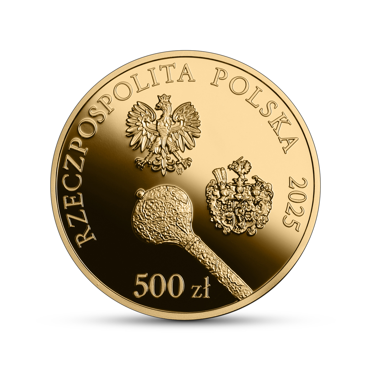 – u góry wzdłuż krawędzi nazwa państwa i rok emisji: RZECZPOSPOLITA POLSKA 2025