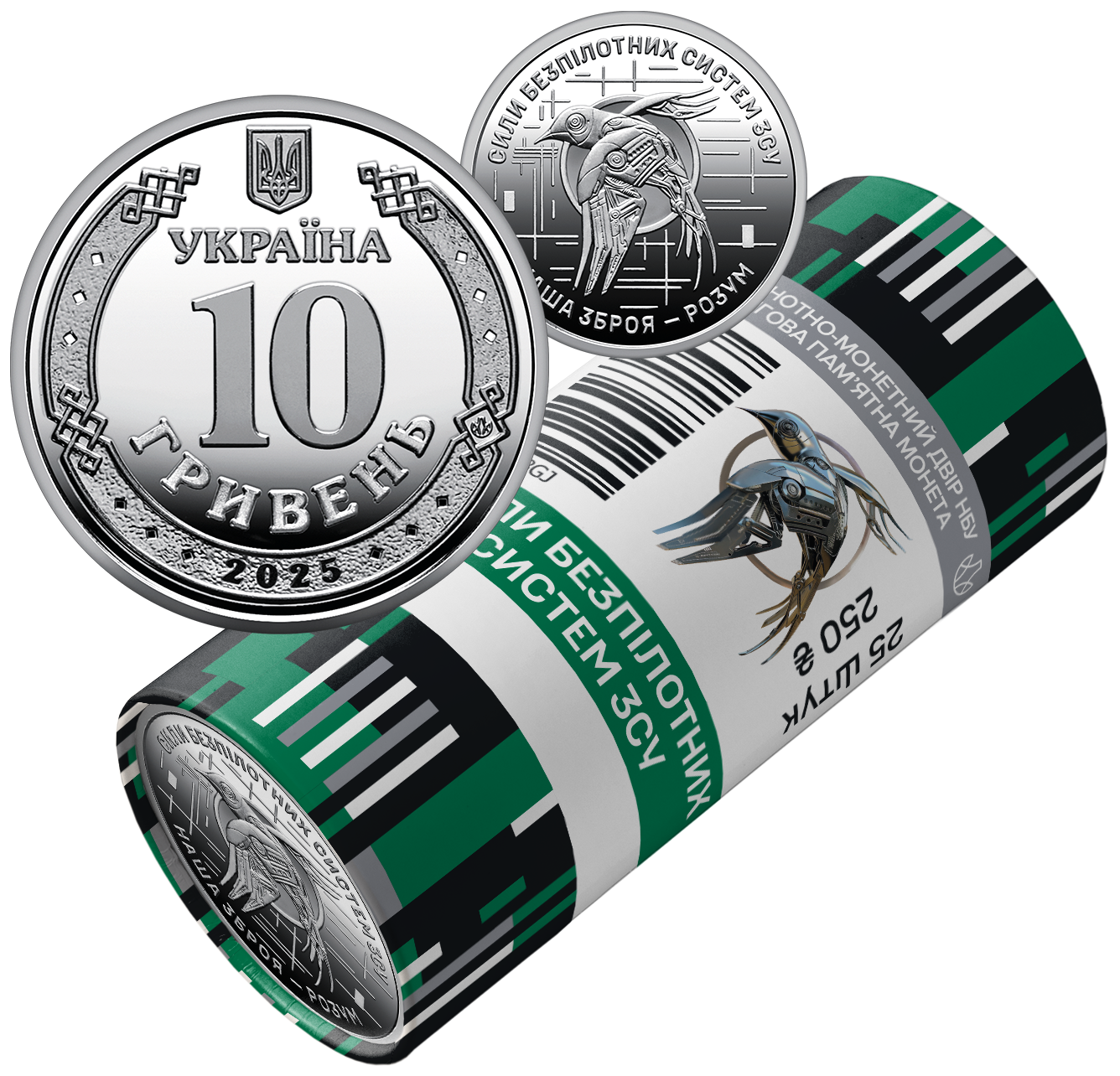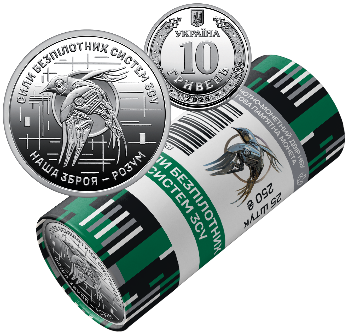 Część nakładu będzie sprzedawana w specjalnie zaprojektowanych rulonach na rynek kolekcjonerski. W górnej części rolki znajduje się napis: БАНКНОТНО-МОНЕТНИЙ ДВІР НБУ / ОБІГОВА ПАМ’ЯТНА МОНЕТА (DRUKARNIA I MENNICA NARODOWEGO BANKU UKRAINY / OBIEGOWA MONETA OKOLICZNOŚCIOWA) oraz logo mennicy. Pośrodku godło formacji. Pod godłem napis: СИЛИ БЕЗПІЛОТНИХ / СИСТЕМ ЗСУ (SIŁY SYSTEMÓW BEZZAŁOGOWYCH SZU). Z prawej strony godła liczba sztuk oraz wartość rulonu: 25 ШТУК / 250 ₴. U góry i na dole rulonu, na paskach, pionowe kreski
