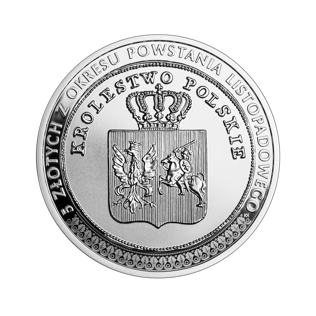 – wzdłuż krawędzi napis: 5 ZŁOTYCH Z OKRESU POWSTANIA LISTOPADOWEGO
