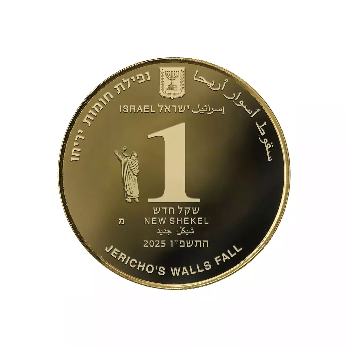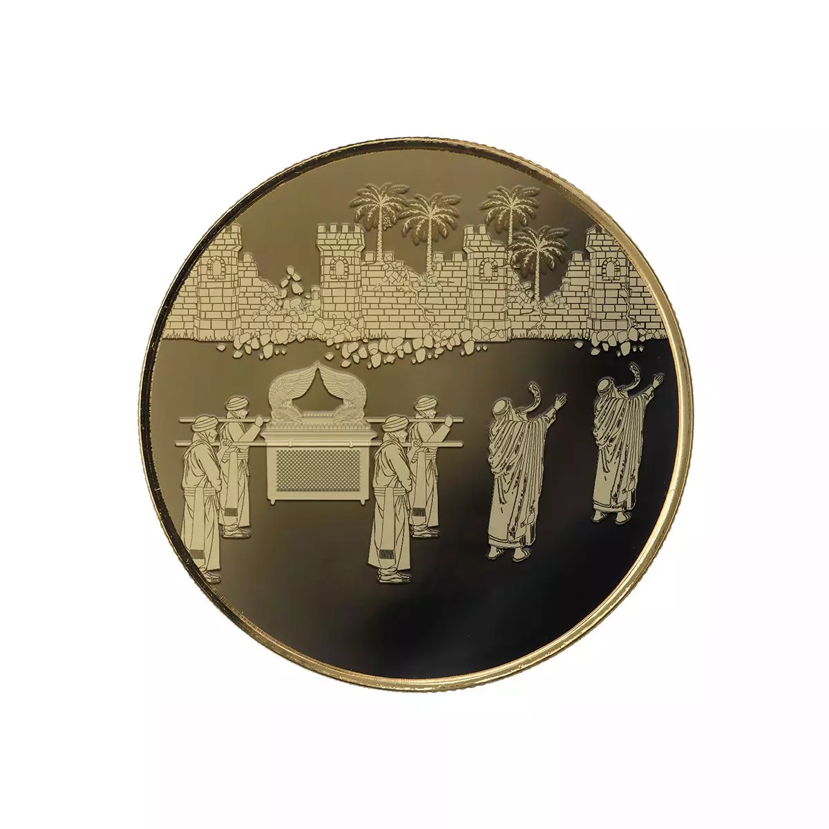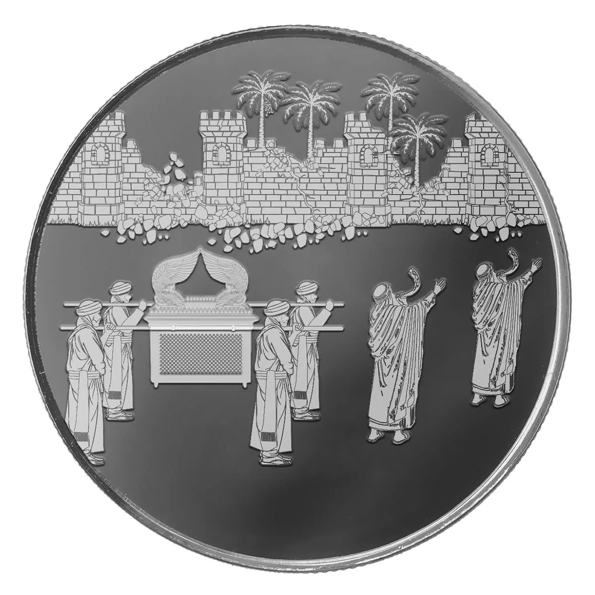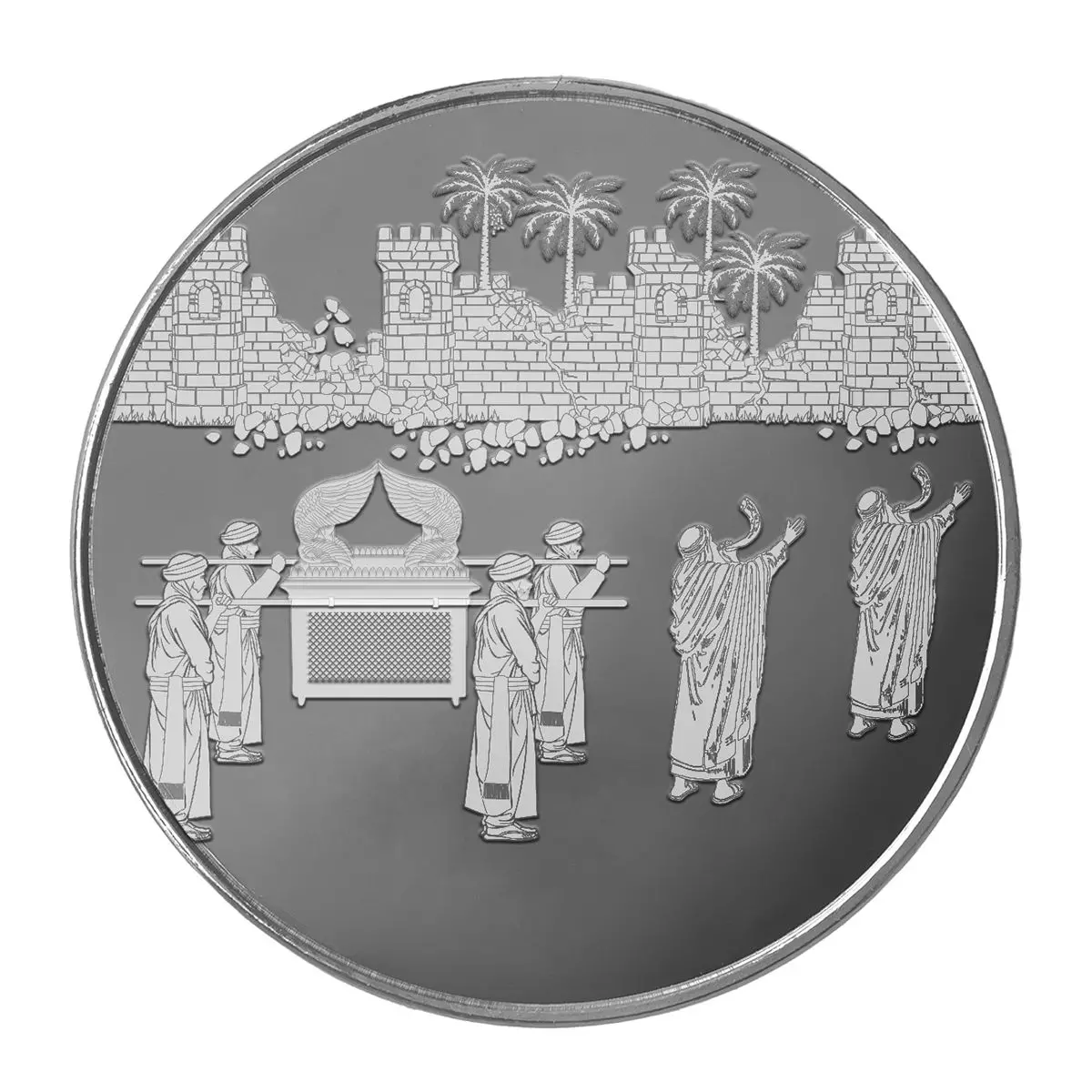 – scena ilustrująca biblijną opowieść. W górnej części monety znajdują się mury Jerycha, które zaczynają się walić. W dolnej części znajdują się kapłani niosący Arkę Przymierza i dmący w szofar
