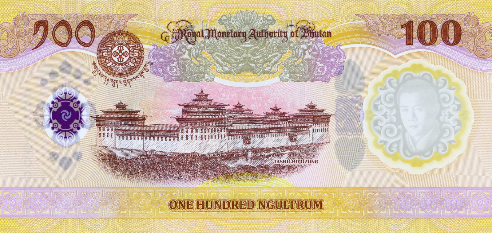 Banknot o nominale 100 ngultrum upamiętnia panowanie Piątego Druk Gyalpo, Jigme Khesara Namgyela Wangchucka, obecnego króla Bhutanu. Jego portret znajduje się na przedniej stronie na tle misternej, kosmicznej mandali. Głowa zwieńczona świętą Koroną Kruka, symbolizującą nieprzerwaną linię i konsolidację narodu. Centralnie przedstawiono dziewięć smoków, symbolizujących dobrobyt i ochronę królestwa.