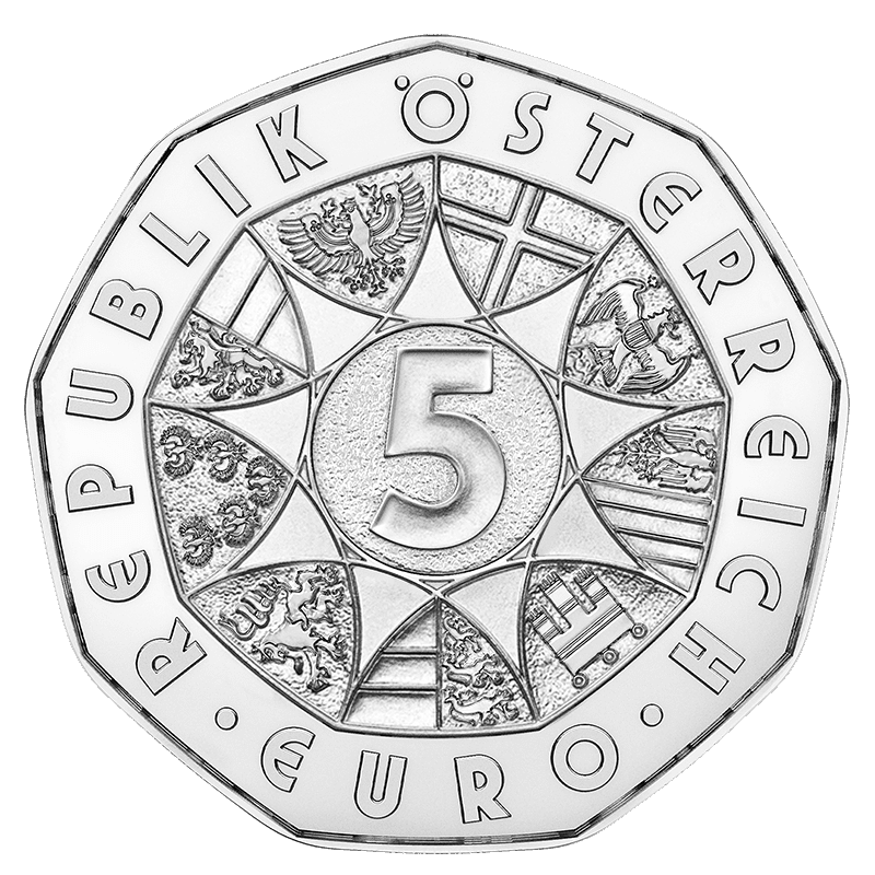 – w centrum okrąg z nominałem „5” otoczony dziewięcioma herbami krajów związkowych Republiki Austrii, od prawej strony: Wiedeń, Burgenland, Górna Austria, Vorarlberg, Karyntia, Styria, Dolna Austria, Salzburg, Tyrol
