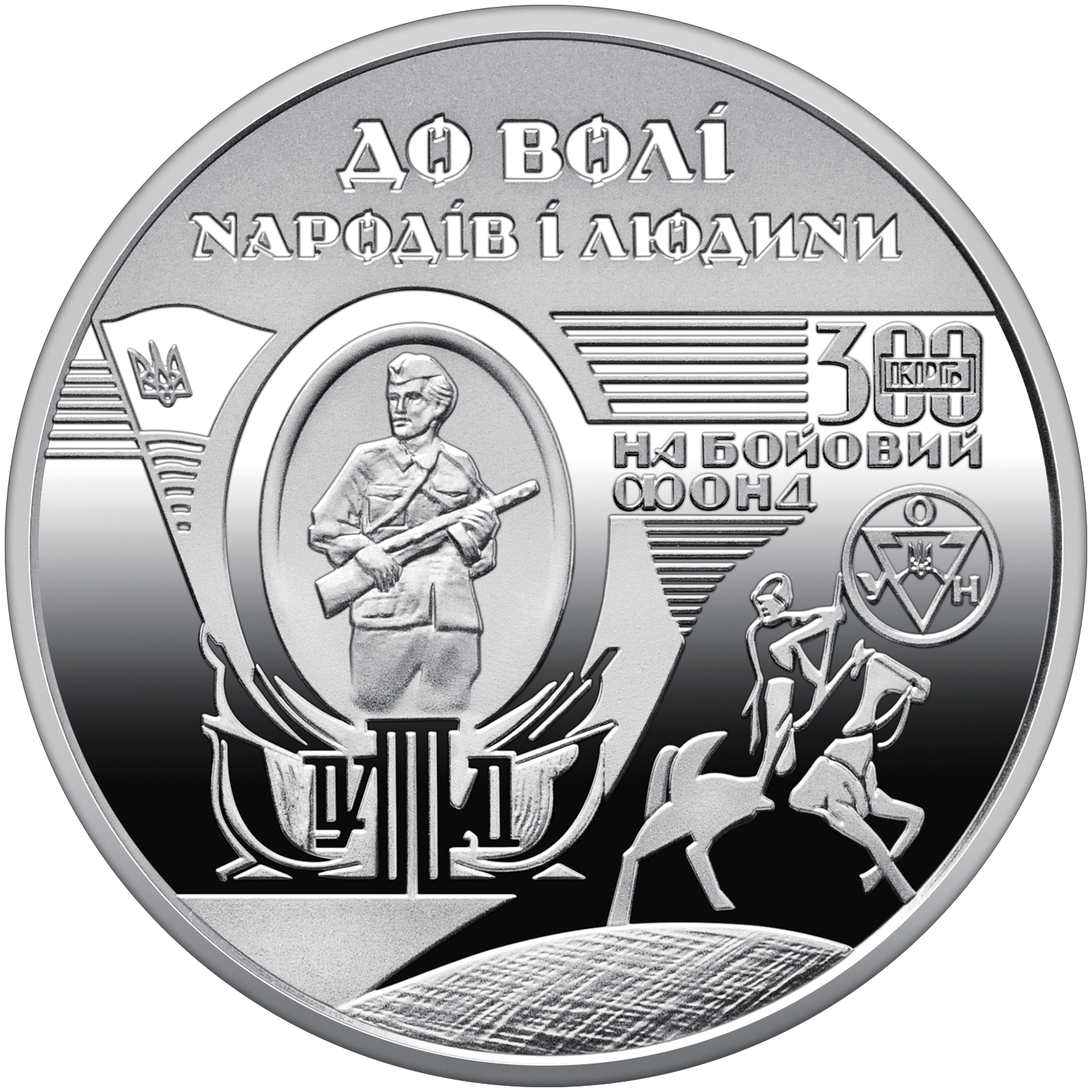 – kompozycja z fragmentów drzeworytu, stylizowanego na banknot bofonu. Kompozycja zawiera elementy grafiki autorstwa Chasiewycza, symbolizujące ekonomiczne, ideologiczne i moralne przesłanie ówczesnego ukraińskiego ruchu oporu. U góry napis „ДО ВОЛІ / НАРОДІВ І ЛЮДИНИ” (DO WOLNOŚCI / NARODÓW I CZŁOWIEKA) oraz „300 КРБ / НА БОЙОВИЙ / ФОНД” (300 KRB (karbowańców) / NA FUNDUSZ / BOJOWY), które podkreślają rolę bofonów w gromadzeniu środków na rzecz ruchu oporu i nawiązują do dzisiejszej praktyki darowizn