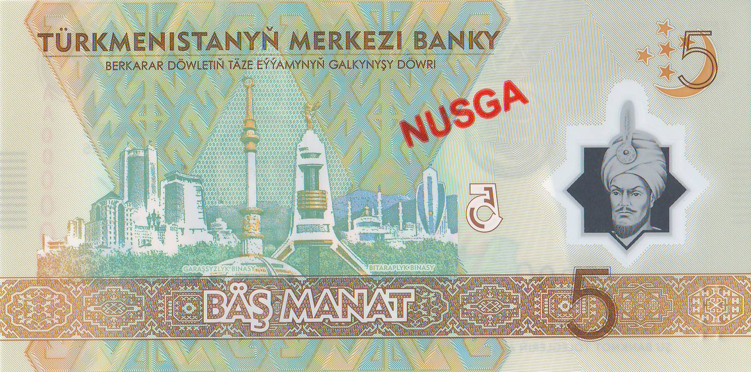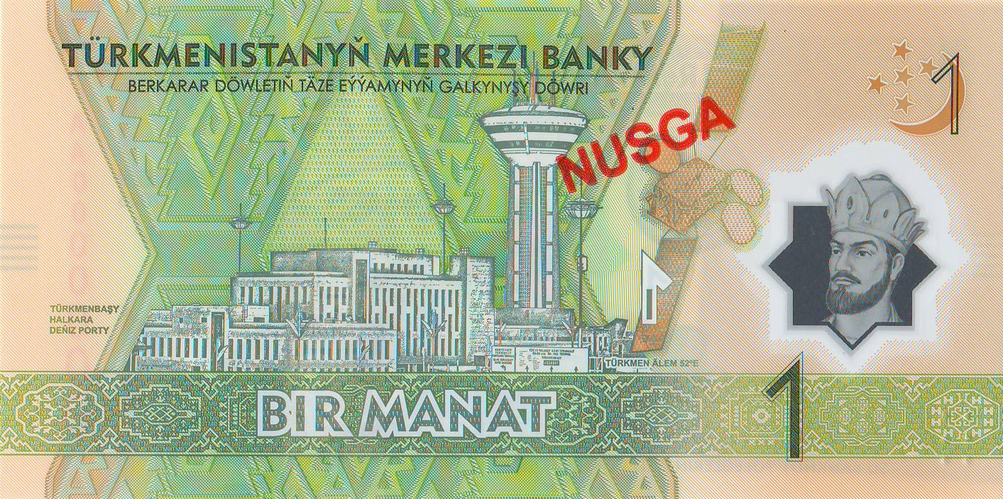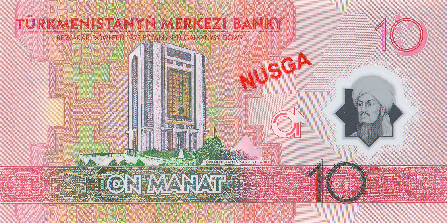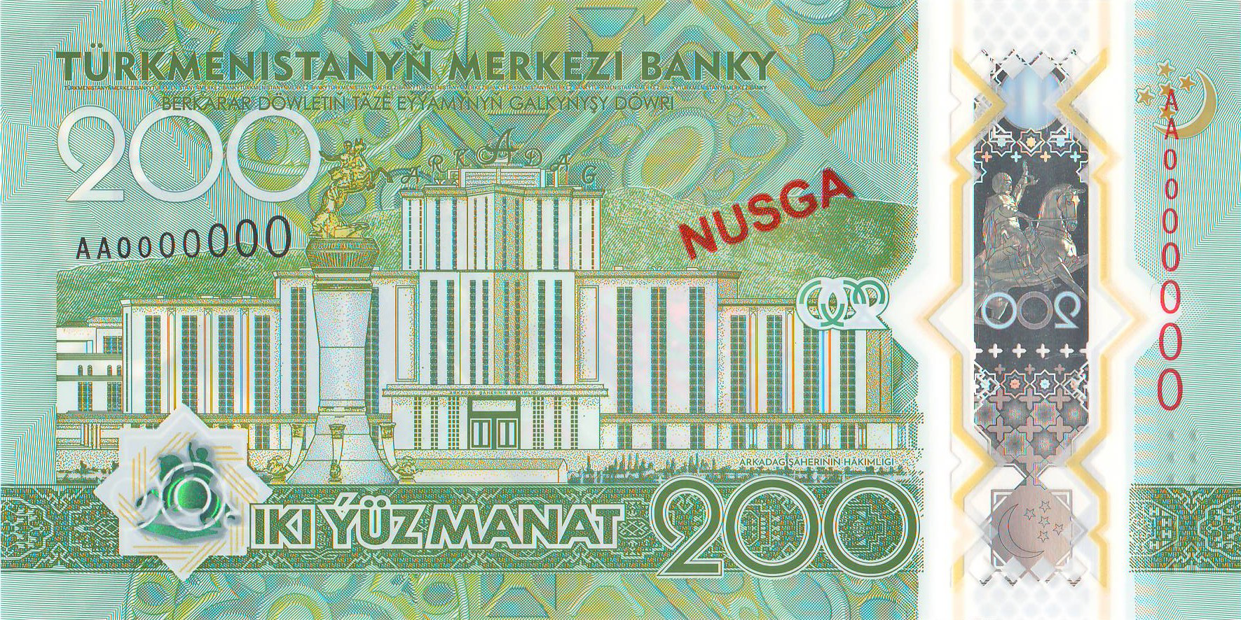 – centralnie wizerunek budynku banku centralnego w Aszchabadzie podpisem „TÜRKMENISTANYŇ MERKEZI BANKY”