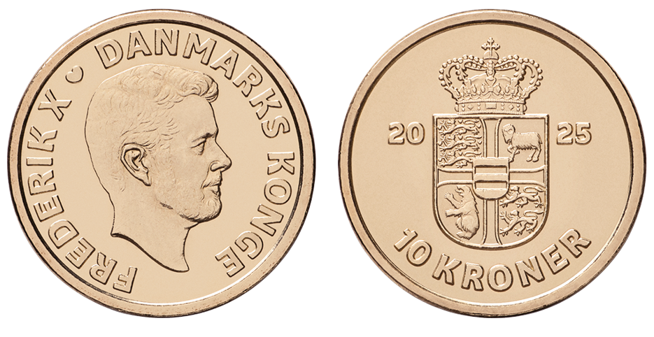 Na awersie monety o nominale 10 koron znajduje się portret Jego Królewskiej Mości Króla Fryderyka X, oraz napisy „FREDERIK X” i „DANMARKS KONGE” (Król Danii). Napisy rozdzielone są sercem. Na rewersie znajduje się herb królewski, rok emisji „2025” oraz nominał i nazwa jednostki „10 KRONER”