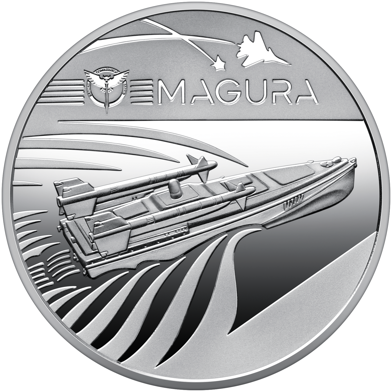 – centralnie stylizowany dron nadwodny Magura, rozcinający morskie fale