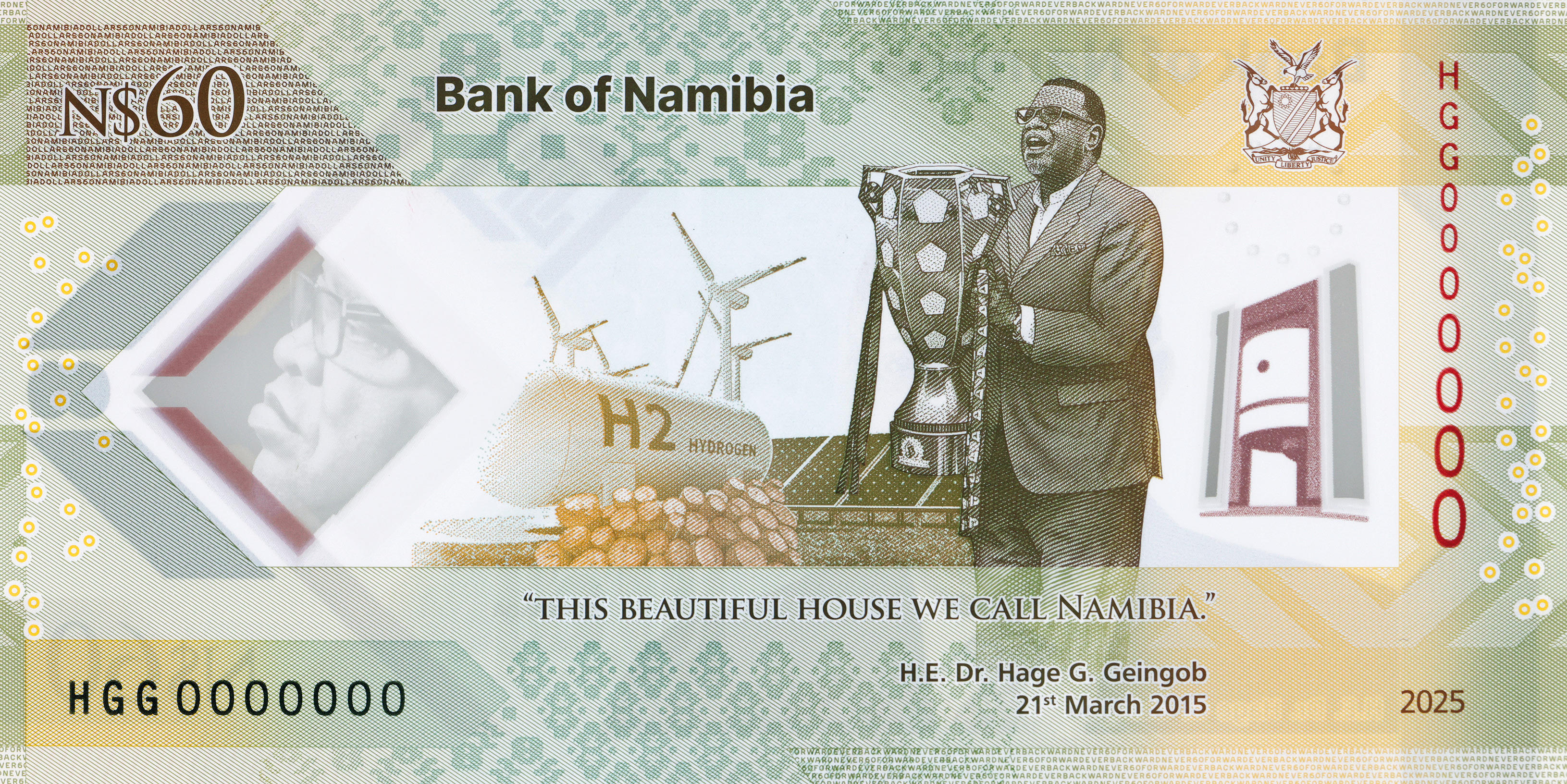 7) Namibia, banknot okolicznościowy, 60 dolarów namibijskich, Upamiętnienie Hage’a Geingoba