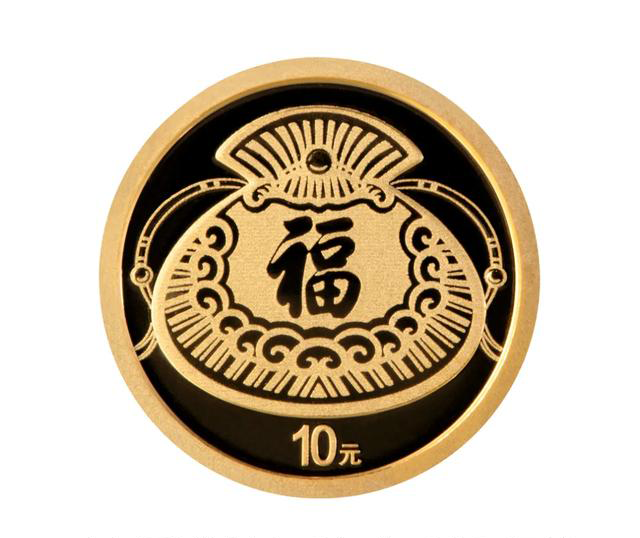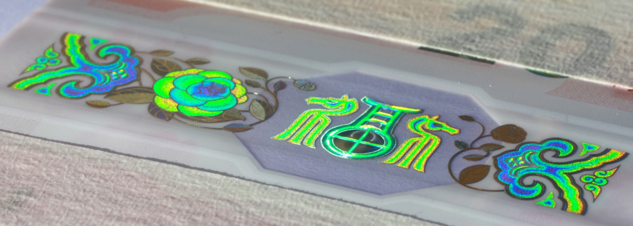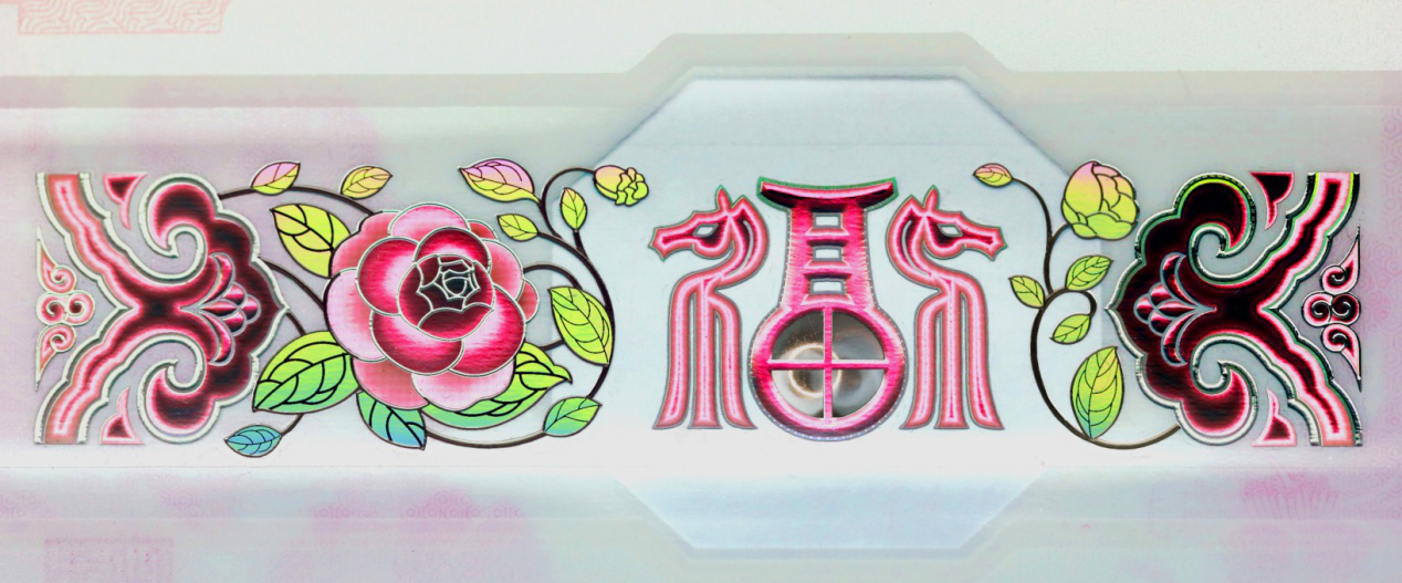 – poniżej pasek z folią holograficzną i okienkiem. Pasek przedstawia tradycyjny chiński wzór chmury w stylu Ruyi oraz kwiaty śliwy. W okienku, o nieregularnym kształcie, stylizowany znak 福 oznaczający błogosławieństwo, szczęście, dobrobyt