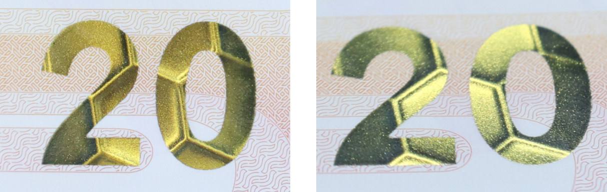 – nominał liczbowy wykonany techniką OVI – farba zmienna optycznie z efektem ruchu, zmieniająca kolor ze złotego na zielony, w zależności od kąta patrzenia