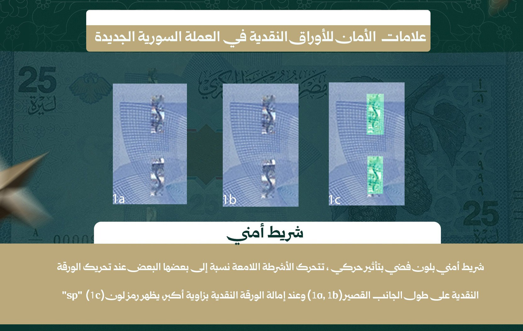 Okienkowy, w kolorze srebrnym z dynamicznym efektem (1a, 1b). Przy większym nachyleniu banknotu pojawia się symbol „sp” od „syrian pound” (1c).