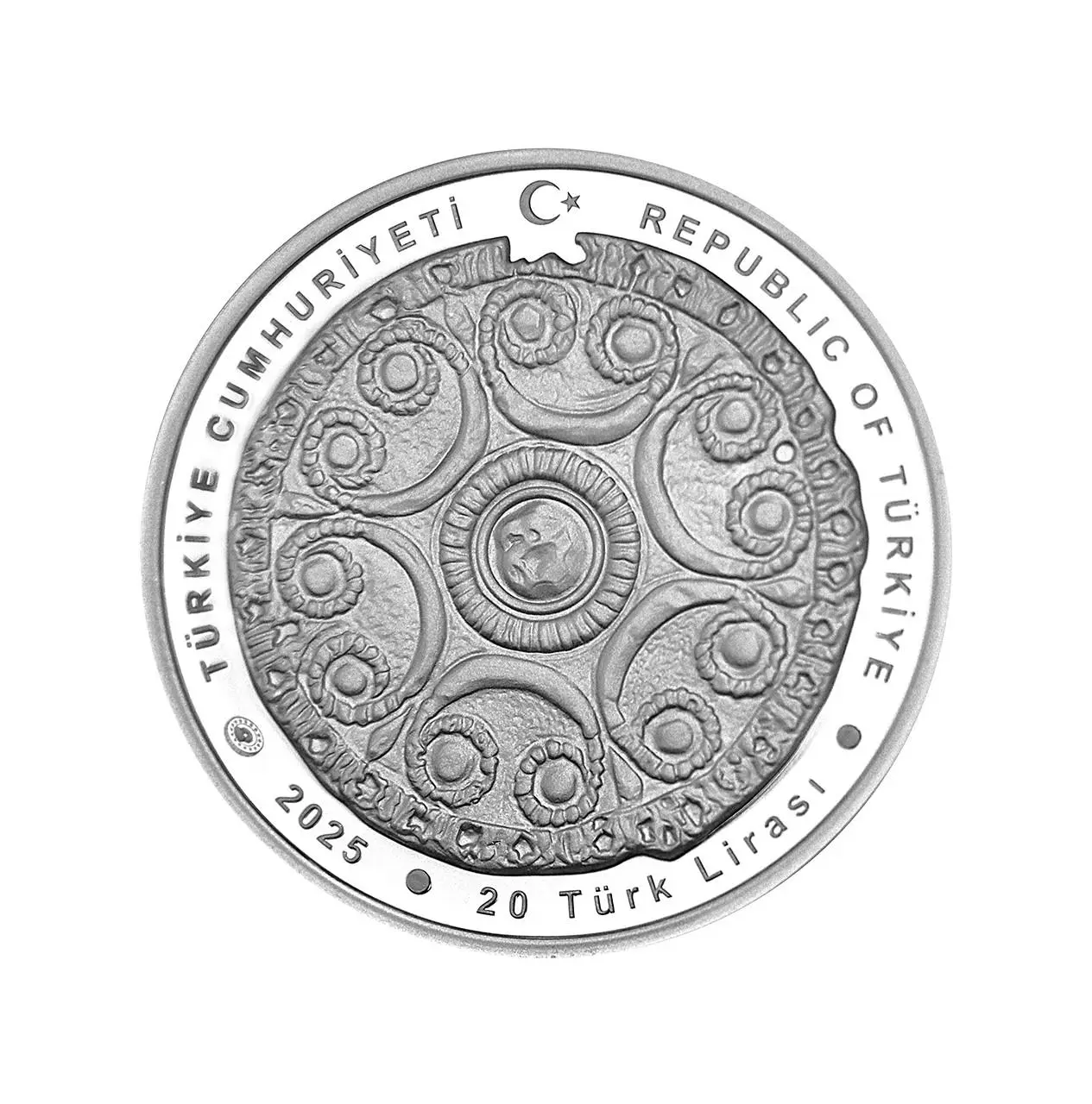 – na dole, wzdłuż krawędzi, znak mennicy, rok emisji, nominał i nazwa jednostki: znak mennicy 2025 ● 20 Türk Lirası ●