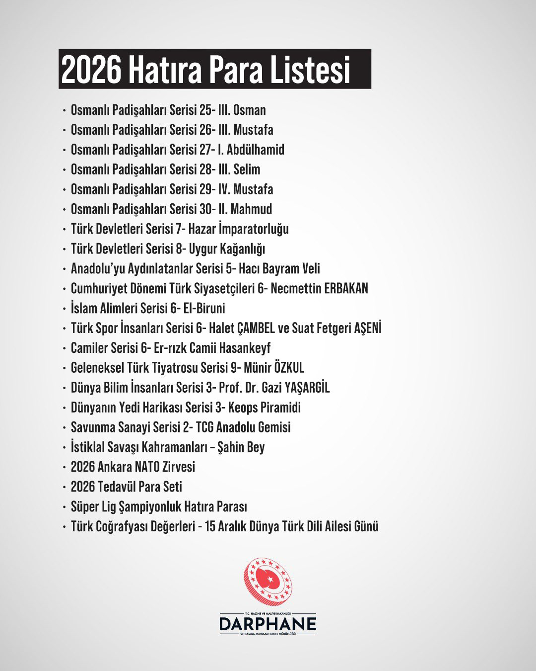 14 stycznia 2026 r. Turecka Mennica Państwowa (Darphane ve Damga Matbaası Genel Müdürlüğü) opublikowała plan emisji walorów kolekcjonerskich w 2026 r. Plan może ulec zmianie.