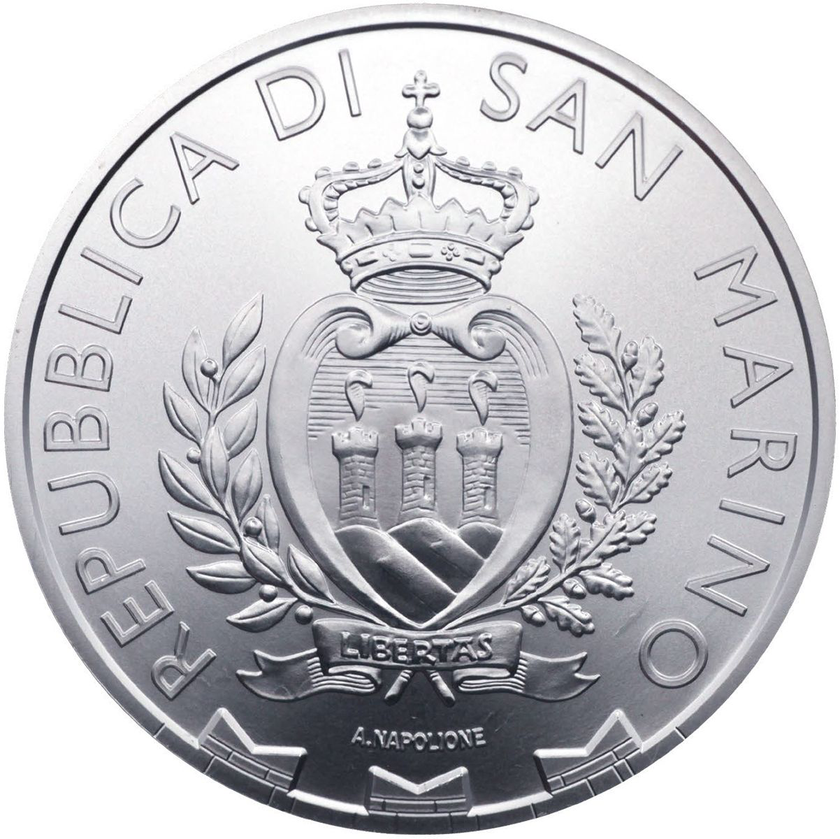 – wzdłuż krawędzi nazwa państwa: REPUBBLICA DI SAN MARINO