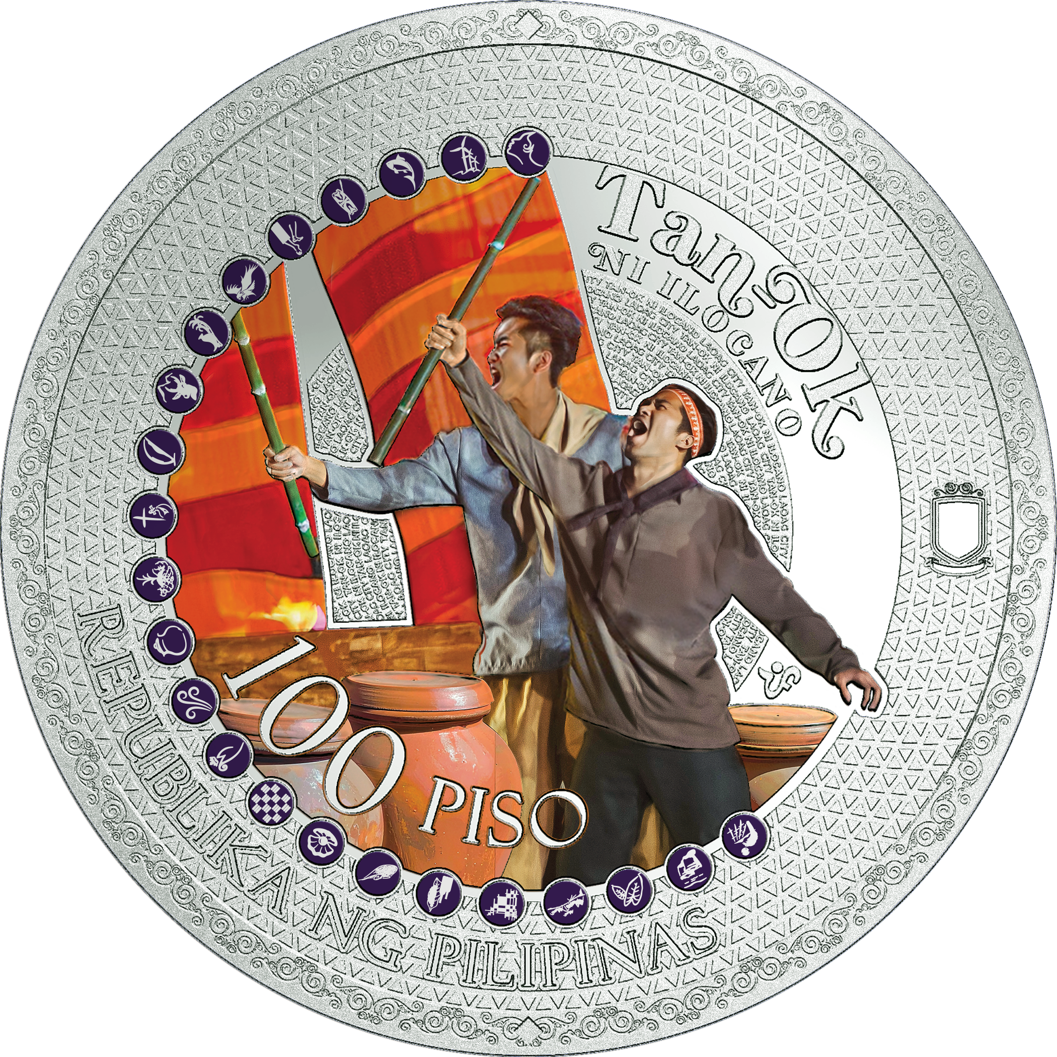 – w tle, w centralnej części pola, mikrodruk zawierający nazwę festiwalu i lokalizację: TAN-OK NI ILOCANO LAOAG CITY. Na otoku widoczne motywy etnicznego wzoru oraz trójkątów