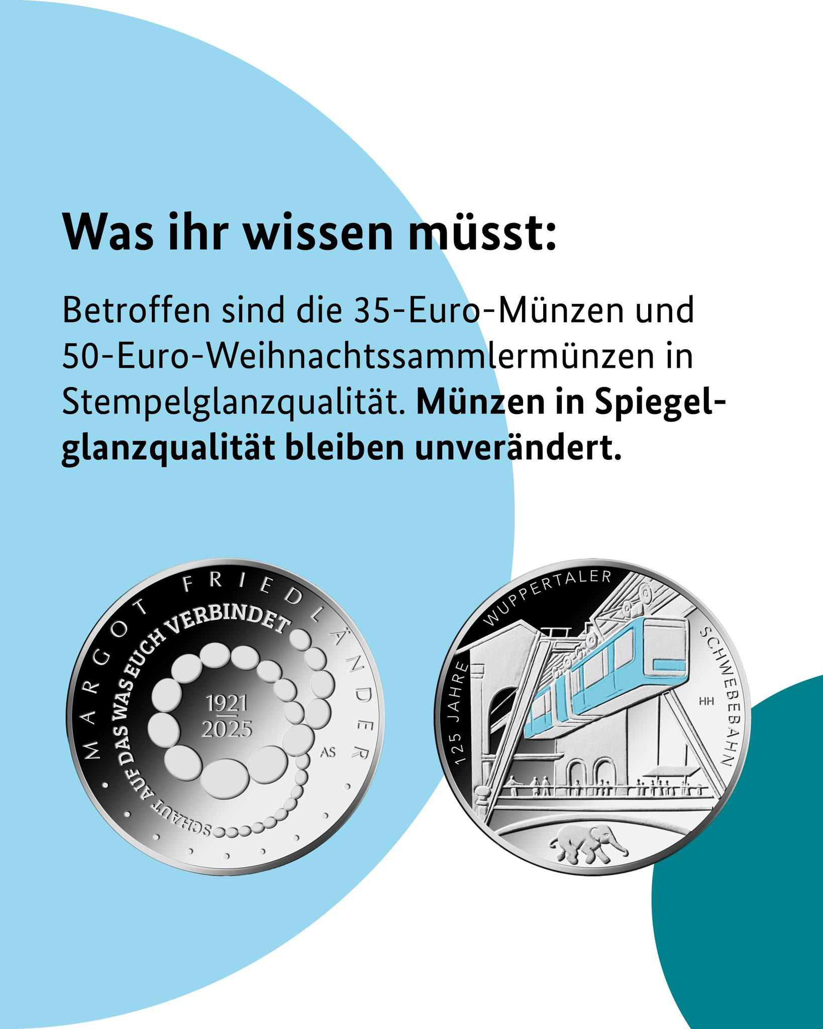 W związku z tym monety serii „Boże Narodzenie” – „Trzej Królowie” o nominale 25 euro (Weihnachten – Heilige Drei Könige, pierwotna data emisji: 20 listopada 2025 r.), jak i moneta kolekcjonerska „125 lat Kolei Podwieszanej w Wuppertalu” (125 Jahre Wuppertaler Schwebebahn) o nominale 20 euro (pierwotna data emisji: 22 stycznia 2026 r.) nie zostały wyemitowane w planowanych terminach. Ministerstwo rozważało ich późniejszą emisję i/lub zmianę parametrów i nominałów.