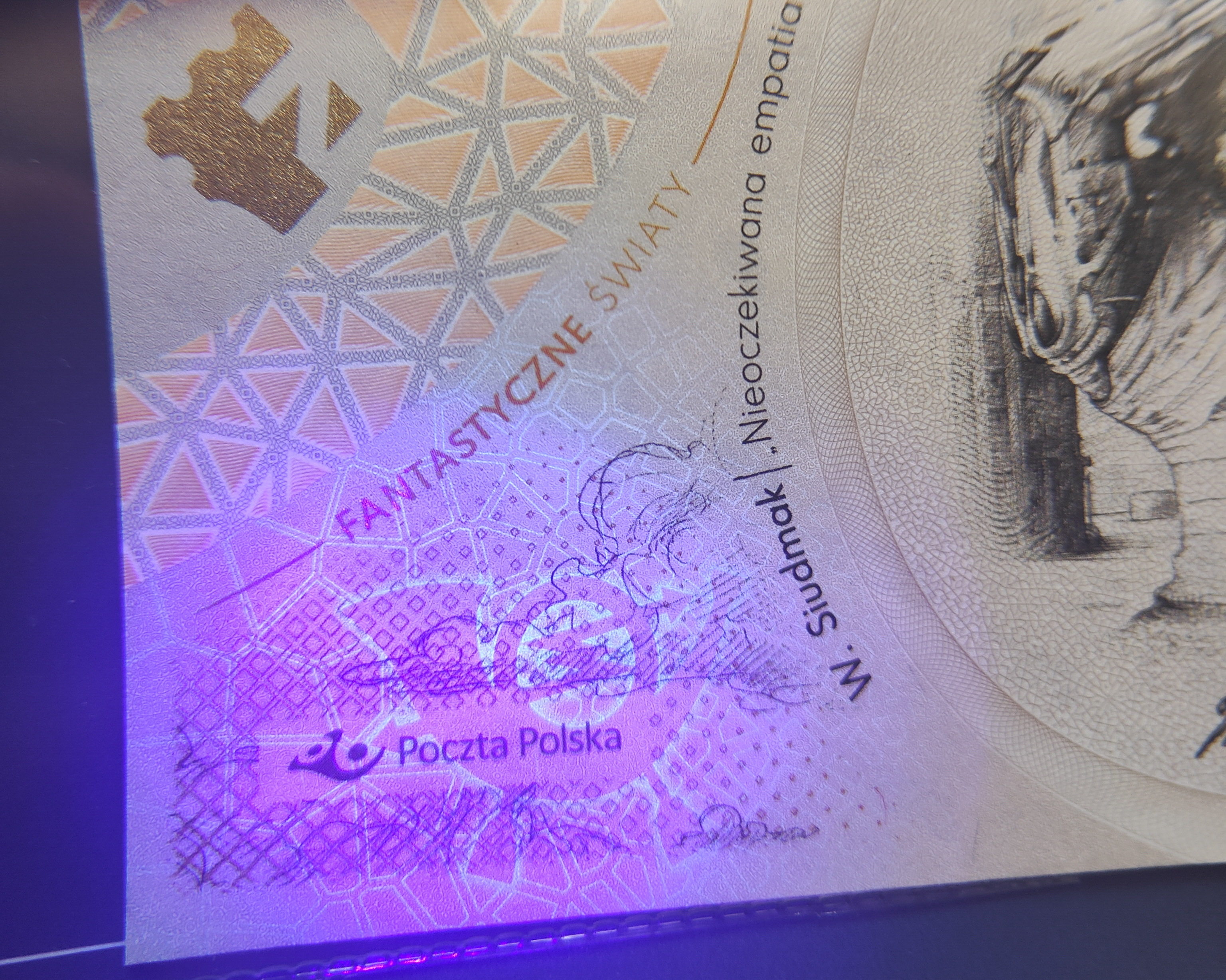 - Nadruki widoczne po oświetleniu waloru promieniowaniem ultrafioletowym. Logo Poczty Polskiej, napis, obwódka geometrycznych ornamentów oraz ukrytego obrazu.