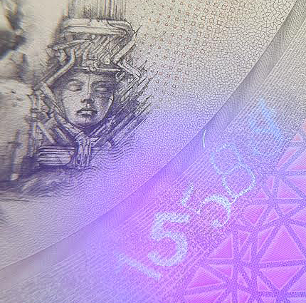 - Mikrotekst o zmiennej grubości i wysokości (POCZTA POLSKA, oraz slogan FILANOTA ŁĄCZY NOTAFILISTYKĘ I FILATELISTYKĘ DWA NIEZWYKŁE PASJONUJĄCE KOLEKCJONERSKIE ŚWIATY w różnych językach).