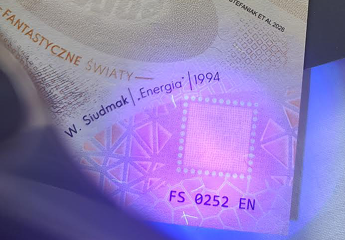 Logo, napisy i obwódka widziana w świetle UV. Na zdjęciach widoczne także włókna; Fot. news.notafilia.pl