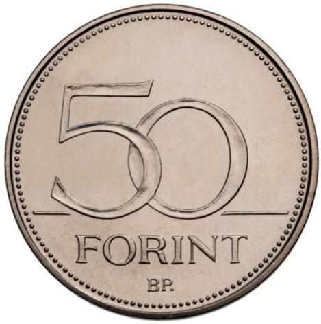 Rewers: Taki sam jak na monecie obiegowej o nominale 50 forintów. Wzdłuż krawędzi ozdobne perły, W centrum nominał, częściowo podkreślony, i nazwa waluty: 50 / FORINT. Pod nazwą waluty znak mennicy: BP. (z kropką na końcu)