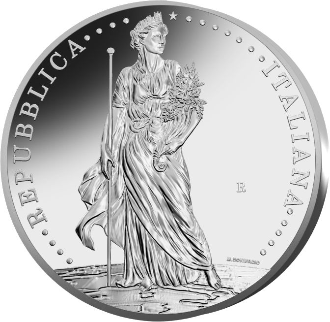 – wzdłuż krawędzi nazwa państwa rozdzielona perłami i gwiazdą. Dwadzieścia pereł reprezentuje dwadzieścia regionów Włoch: •••• REPUBBLICA ••••★••••••• ITALIANA •••••