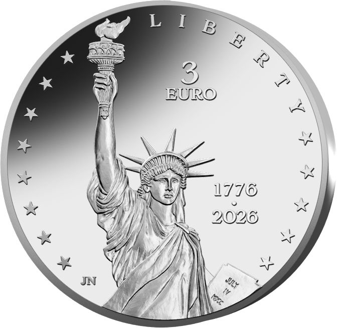 – wzdłuż krawędzi na dole rok uzyskania niepodległości przez Stany Zjednoczone, nominał i nazwa jednostki oraz rok emisji: 1776 • 50 EURO • 2026